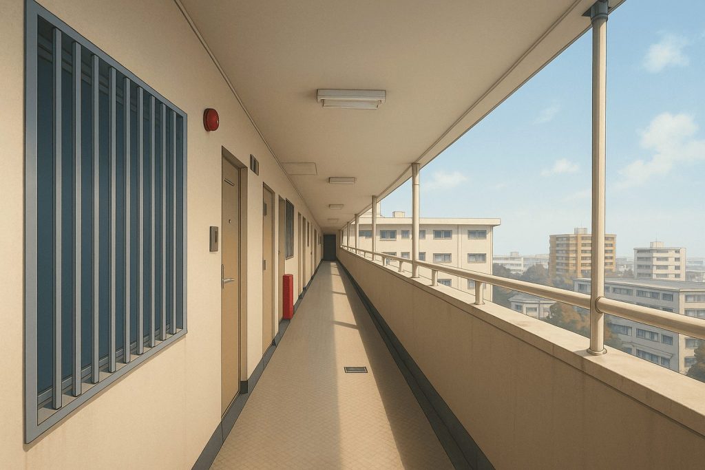 - 開放廊下型(外気に開放された通路に居室が面している)