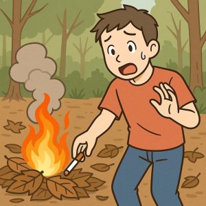 • キャンプファイヤー後の火の粉が草に燃え移る