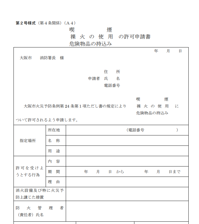 厨房設備や暖房機器など、火を使用する設備を設置する場合には、この届出書の提出が義務付けられています。設備の概要や設置場所、安全対策などを記載する必要があります。