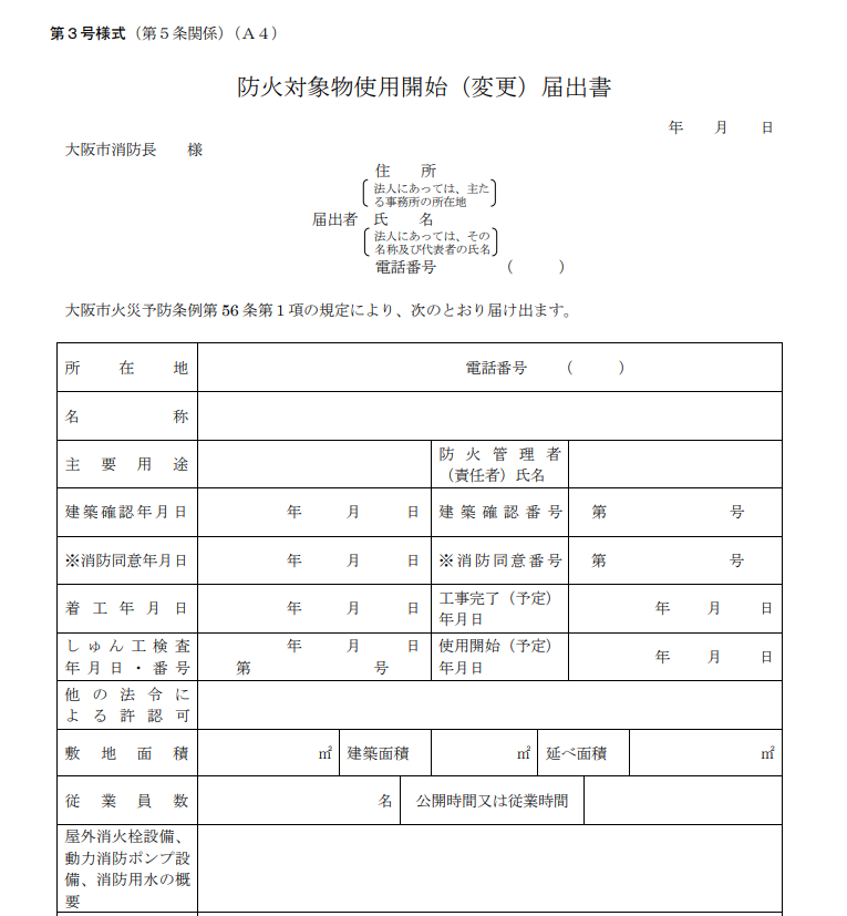 この届出書は、飲食店の新規開業時や増改築時に提出が必要になります。店舗の概要や消防設備の内容を記載し、消防署に提出します。