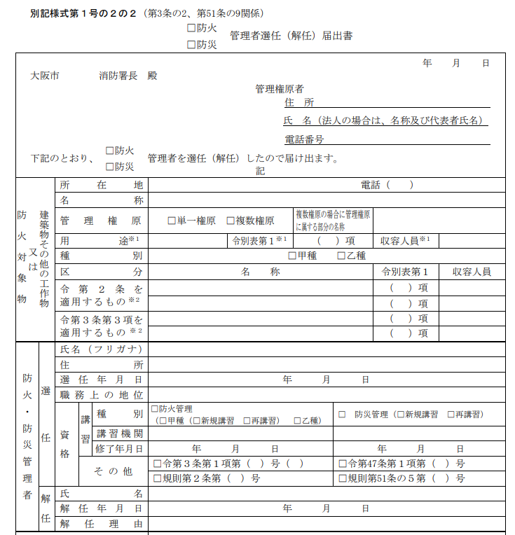 収容人員が30人以上の飲食店では、防火管理者を選任し、この届出書を提出する必要があります。防火管理者は、従業員の防火教育や防火対象物の点検、消防計画の作成などを担当します。
