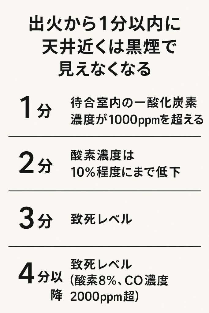 火はわずか10秒で天井に達し、30秒ほどで黒煙がフロアを覆い、1~2分で致死レベルの一酸化炭素濃度に達したとされています。さらに、3分以内には酸素濃度が急激に低下。多くの方は、逃げる間もなく命を奪われました。