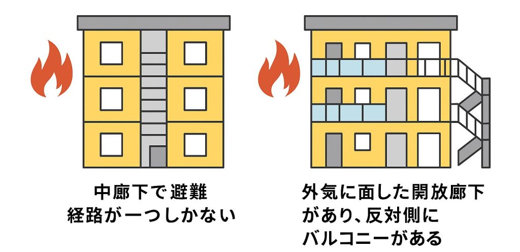 たとえば、「中廊下で避難経路が一つしかない」建物と、「外気に面した開放廊下があり、反対側にバルコニーがある」建物では、火災時の避難のしやすさが大きく違います。